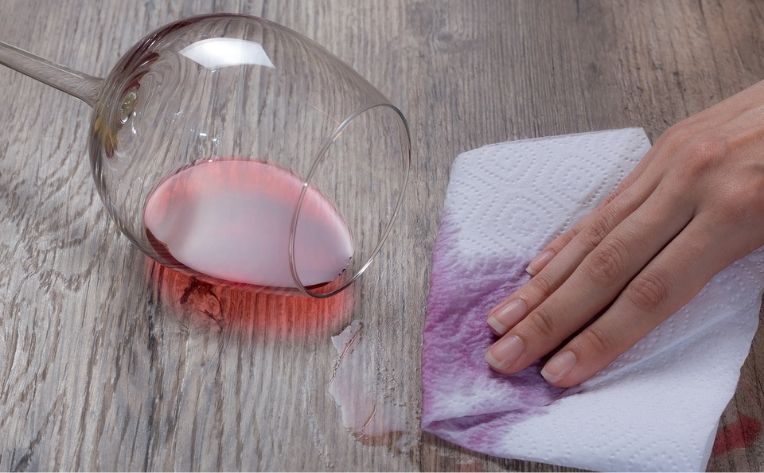 If your red wine spill happened on a wood floor, the process is slightly different. After you’ve soaked up the excess wine, try using an oil soap, such as Murphy’s, mixed with water, and then scrub the floor surface so that, ideally, the stain lifts. Another DIY solution is to mix some baking soda with mineral oil, and then rub the paste on the stain. After about a half hour or so, remove the paste with a dry cloth. (As always, before using any DIY solution on a wood floor, contact your flooring manufacturer first!)